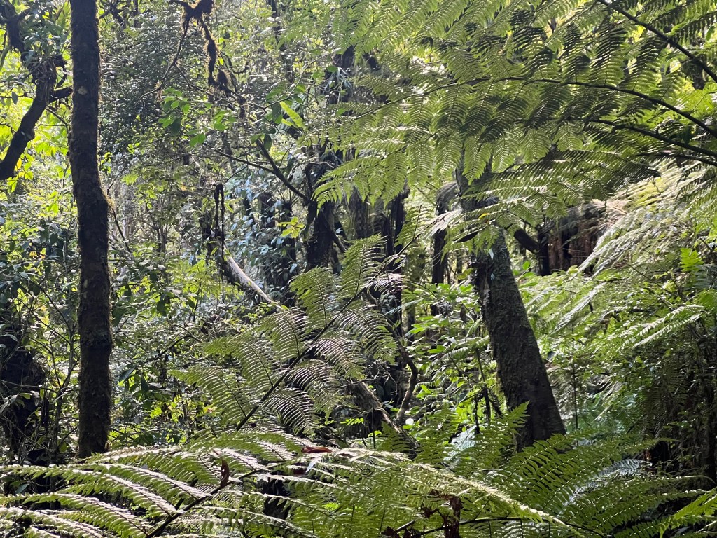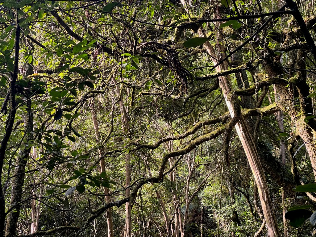 The steep path comforts the towering shape of the Araucarias, they only reveal themselves when allowing us to take our eyes off the ground. In the thick vegetation their roots grab a strong hold on the ground and their bark is reminiscent of snake skin, creating scales that spiral high above. The environment offers a stack contrast that projects my mind into deep reflexion. In this Cretaceous forest I feel the smallness of the human time on earth, and the fragility of the earth itself. These trees provided sustenance for the very tallest of dinosaurs, and humans almost brought them into extinction with logging in only a few decades. We reach a plateau above and see the perfect spectacle of the forest, creating platforms, like Lilly pads, high up in the air.
