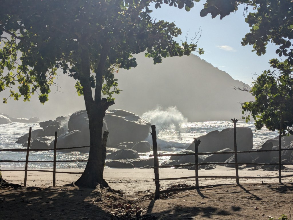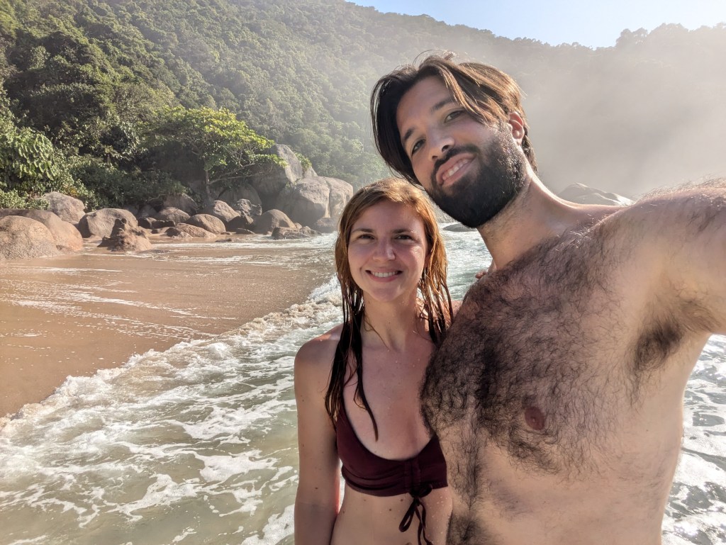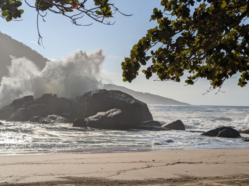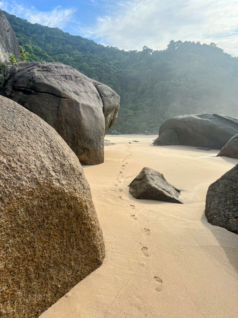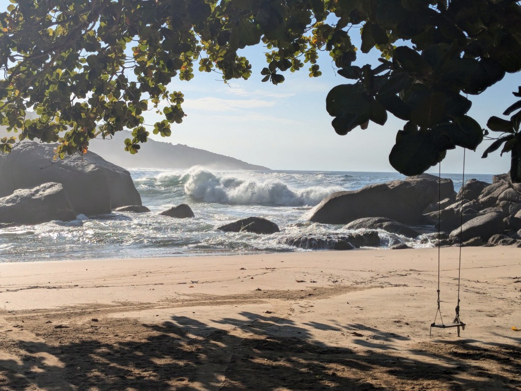 Nous avons atteint la plage de Sumaca après une journée entière de randonnée éprouvante à travers l’épaisse forêt tropicale atlantique et sous une chaleur étouffante. À six heures du matin, nous nous sommes mis en route, profitant des heures les plus fraîches. Nous avons joyeusement traversé la montagne faisant face à la plage des Engenho (sur des « sentiers » qui ne seraient certainement pas autorisés en Europe). La première plage de la randonnée, Praia Grande, était complètement vide lorsque nous l’avons atteinte, et se baigner après quatre heures de lutte contre la chaleur, la sueur, la soif et l’altitude nous a semblé être un cadeau.