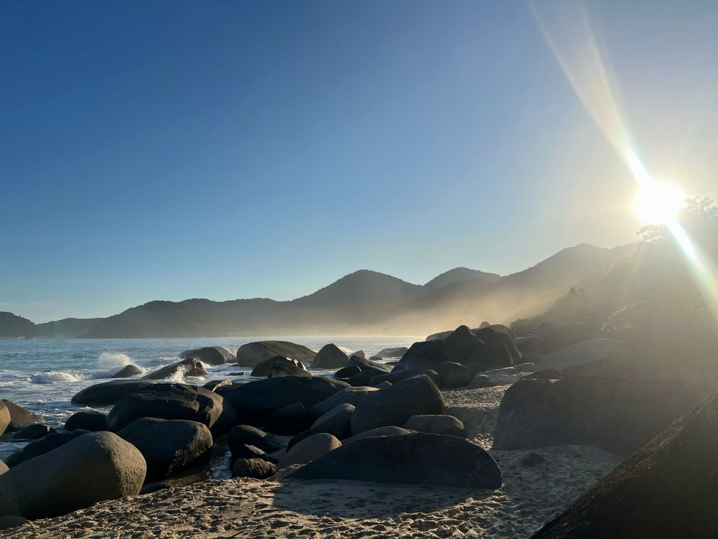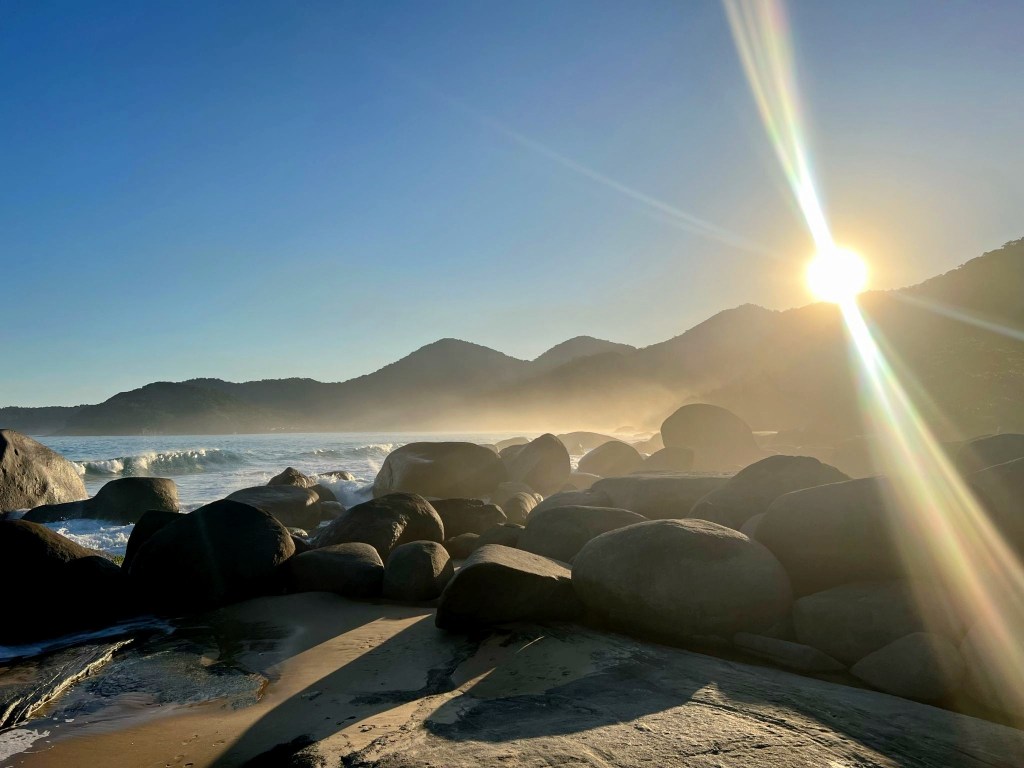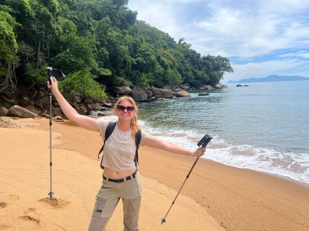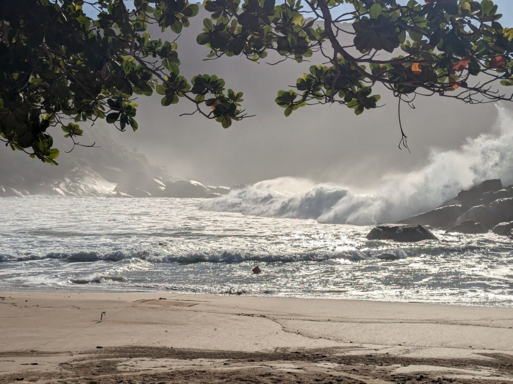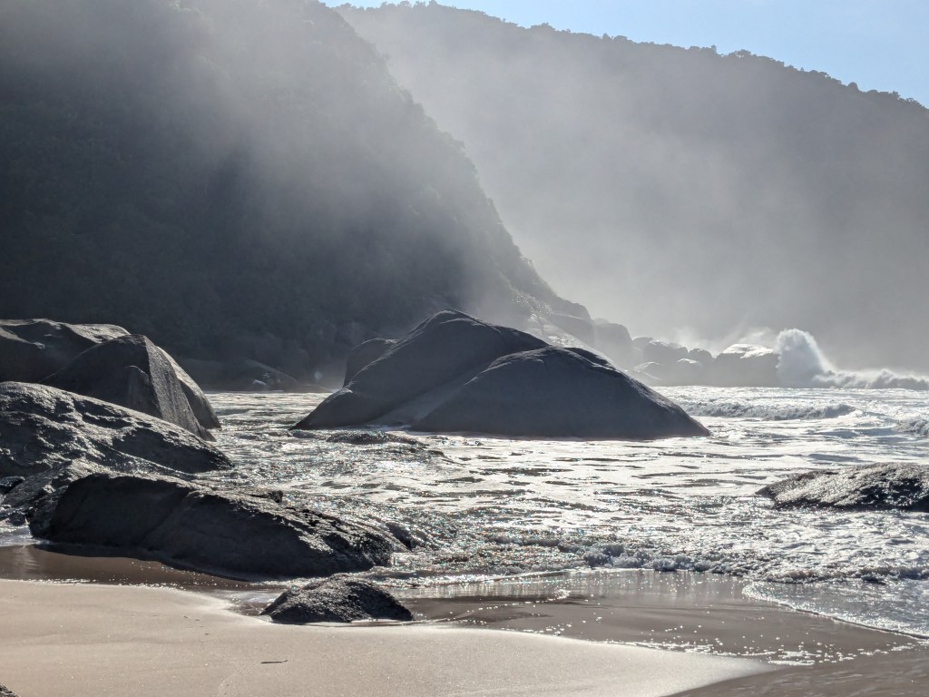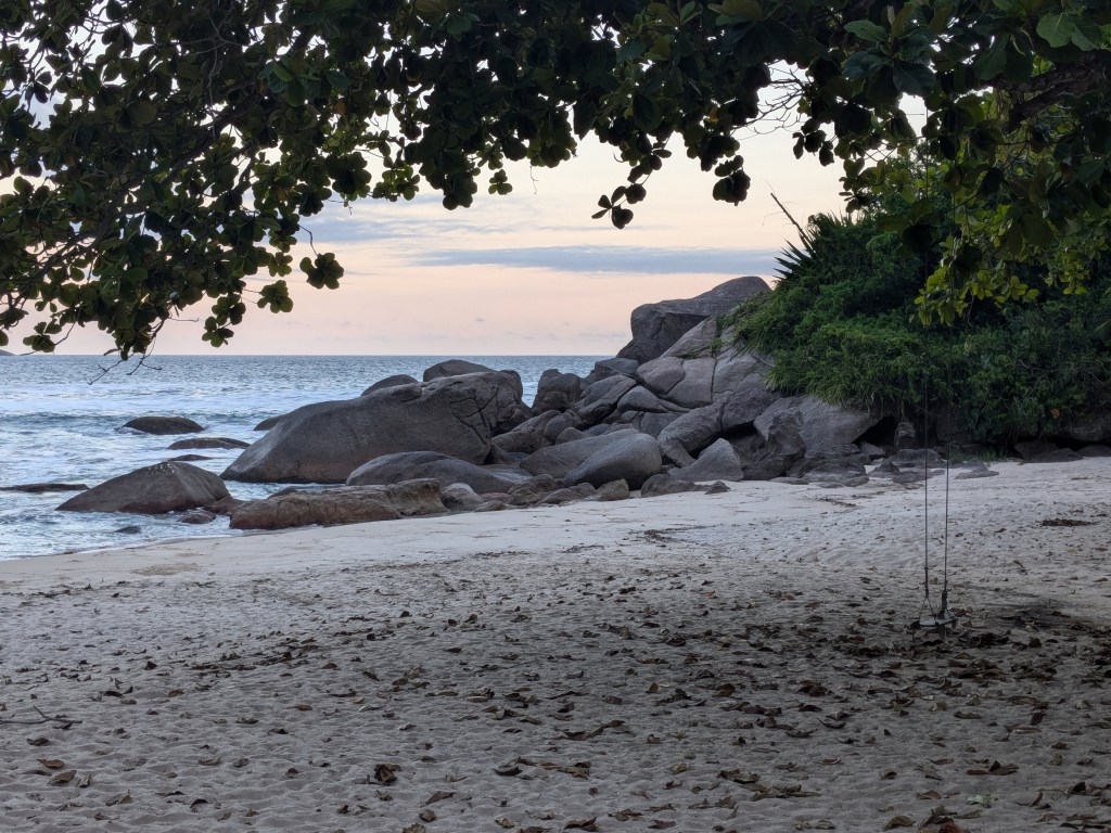 Nous avons atteint la plage de Sumaca après une journée entière de randonnée éprouvante à travers l’épaisse forêt tropicale atlantique et sous une chaleur étouffante. À six heures du matin, nous nous sommes mis en route, profitant des heures les plus fraîches. Nous avons joyeusement traversé la montagne faisant face à la plage des Engenho (sur des « sentiers » qui ne seraient certainement pas autorisés en Europe). La première plage de la randonnée, Praia Grande, était complètement vide lorsque nous l’avons atteinte, et se baigner après quatre heures de lutte contre la chaleur, la sueur, la soif et l’altitude nous a semblé être un cadeau.