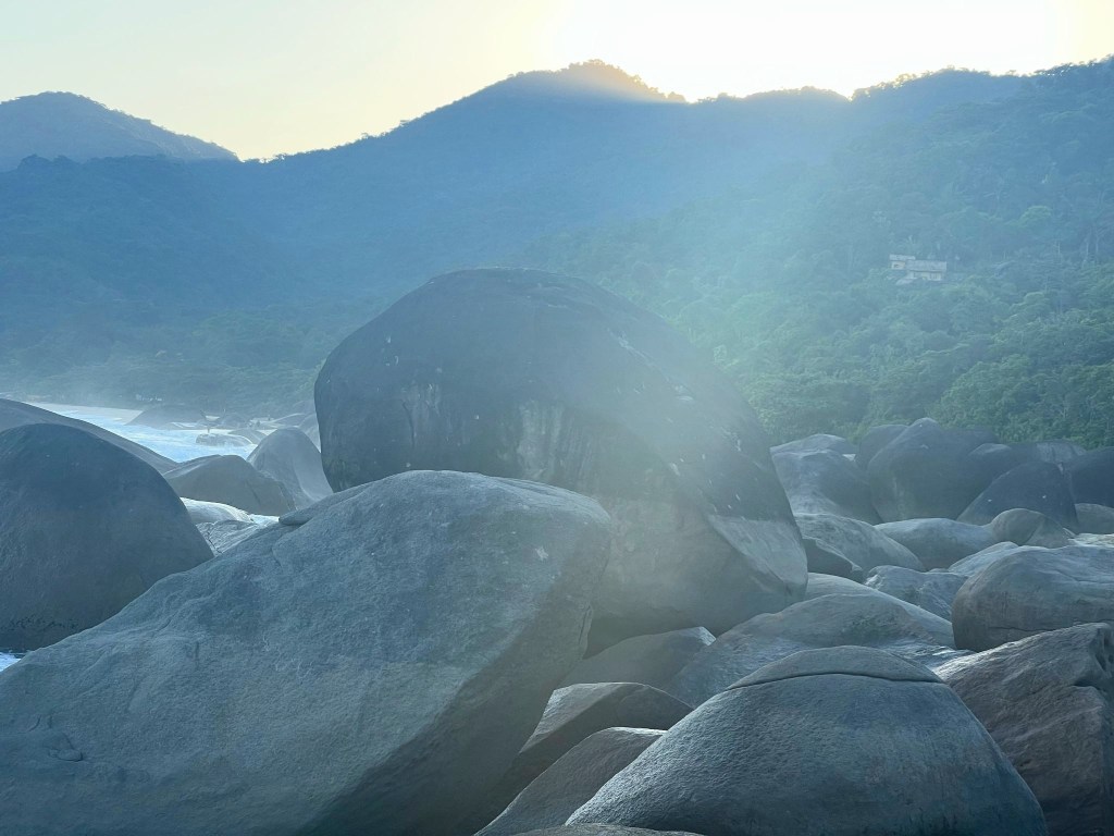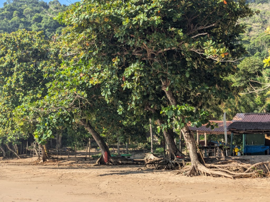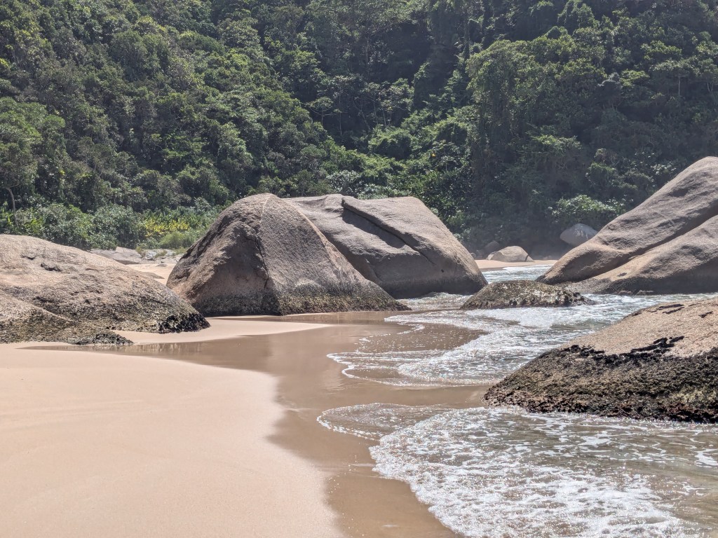 Nach Paraty, einer kleinen, aber touristisch beliebten hübschen Stadt im Kolonialstil, und Paraty-Mirim, ihre kleinere Schwester weiter im Wald, war Sumaca die dritte Station unserer Küstenwanderung an der „Costa Verde“ Brasiliens. Diese Region ist eine der schönsten Gegenden Brasiliens; der einzige Ort, an dem die Bäume des atlantischen Regenwaldes ihre Äste direkt in den azurblauen Ozean tauchen. Der alte Baumbestand reicht hier bis in den orangefarbenen Sand der unberührten Strände, voller großer runder Felsbrocken, die das Meer über Jahrhunderte geformt hat.