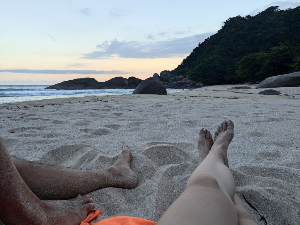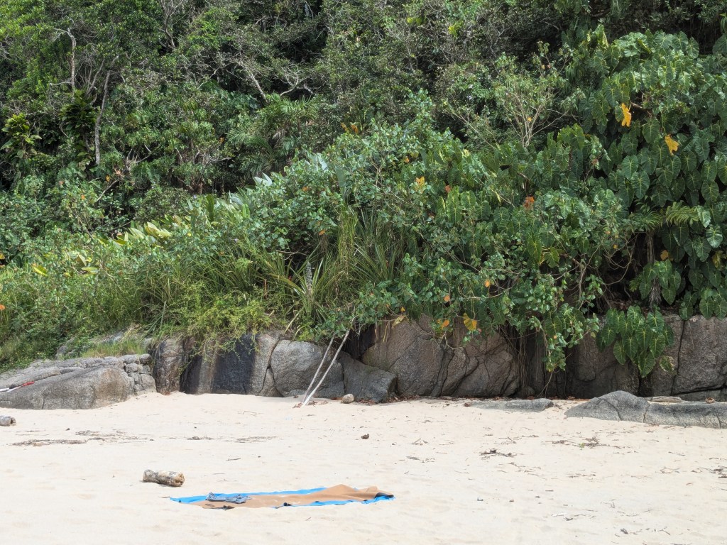 Wir erreichten den Strand von Sumaca extrem erschöpft nach einem ganzen Tag anstrengender Wanderungen durch dichten atlantischen Regenwald und brütende Hitze. Um sechs Uhr morgens hatten wir uns auf den Weg gemacht um die „kühlsten“ Stunden auszunutzen. Gut gelaunt überquerten wir einen dicht bewaldeten Berg, auf „Pfaden“, die in Europa sicher nicht erlaubt wären. Der erste Strand der Wanderung – Praia Grande – war völlig leer, als wir ihn erreichten, und das Nacktbaden im Meer nach vier Stunden Kampf gegen Hitze, Schweiß, Durst und Höhe fühlte sich herrlich an. Praia Grande ist, wie der Name schon sagt, sehr, sehr groß, und am anderen Ende fanden wir, nach ein paar Stunden Dösen im Sand, einen kleinen Saft-Stand und ein paar Menschen.