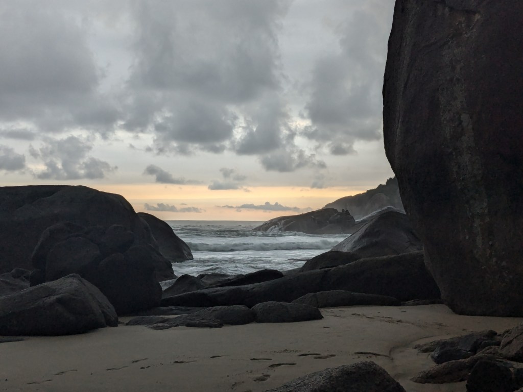 We reached Sumaca beach after a full day of strenuous hiking through thick Atlantic rainforest and sweltering heat, exhausted. At six in the morning, we had been on our way, taking advantage of the ‘coolest’ hours. Cheerfully, we crossed a mountain full of thick forest, slippery strems and flowers (on ‘trails’ that would certainly not be allowed in Europe). The first beach of the trek – Praia Grande, was completely empty when we reached it, and skinny-dipping after four hours of fighting heat, sweat, thirst and elevation felt like a gift.Praia Grande is, as the name says, very, very long, and at the very end of it, we later found a small juice-shag and a few people, in the middle of nowhere.