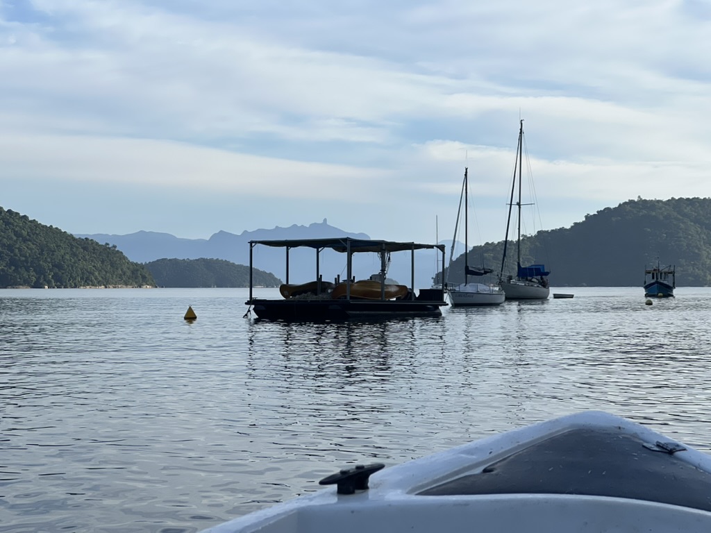 A six heures du matin, le réveil sonne pour nous préparer à notre départ, et sous le regard hébété des habitants de l’auberge, revenant à cette même heure, nous nous dirigeons, bâtons de randonnée, chaussettes longues et sac à dos de randonnée à la main. Nous avons organisé un transport en bateau pour la première partie de la randonnée, pour traverser le « Fjord » de Juatinga. Alors que nous atteignons la fin du chemin de terre et que nous arrivons à la jetée, nous nous rendons compte que sans aucun réseau et n’ayant jamais rencontré notre passeur, nous ne sommes peut-être pas dans la meilleure situation pour faire notre voyage. Heureusement, après avoir interrogé quelques pêcheurs sur l’identité de notre mystérieux capitaine, nous montons dans le bateau à fond plat qui nous emmènera de l’autre côté. Le trajet n’est pas long, mais il nous fait gagner de nombreuses heures en nous plaçant au pied de la traversée. Nous posons le pied sur la plage déserte de Praia dos Engenho et, avec un doigt général de notre guide indiquant où commencer la randonnée, nous préparons notre ascension.