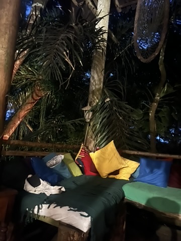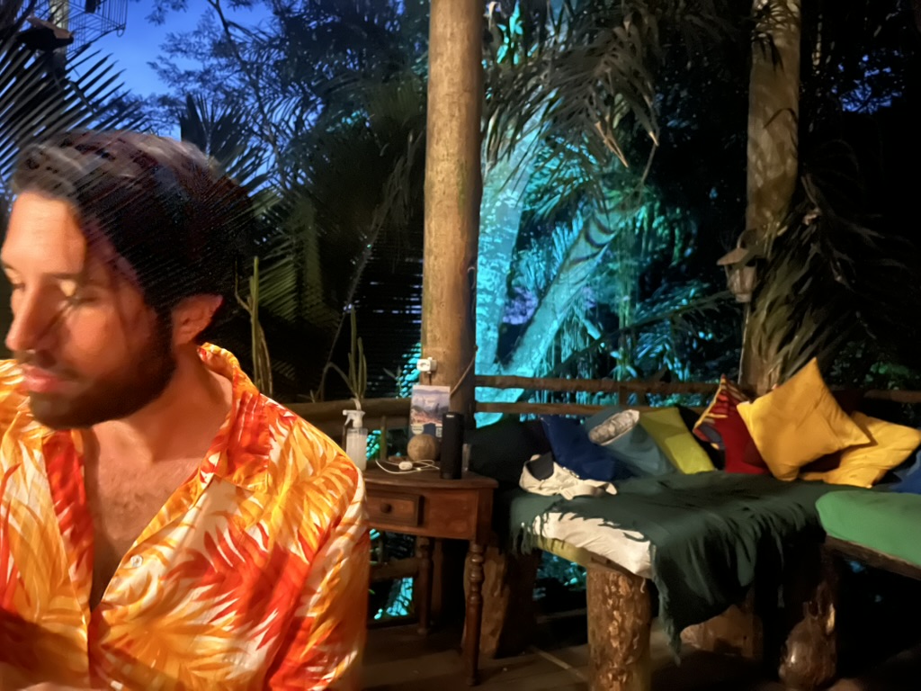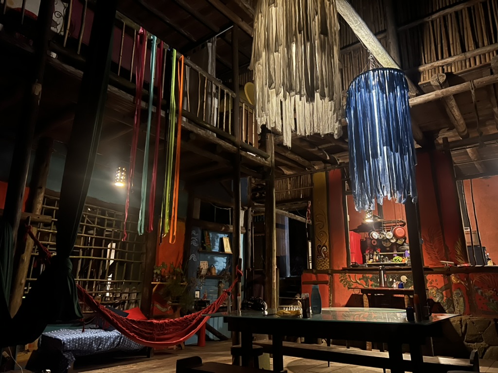 Nous arrivons à notre auberge et découvrons une construction incroyable, qui semblerait chez elle dans un roman de Robinson Crusoé. Des poutres de bois séparent les planchers déconnectés, ce qui crée une géométrie complexe. On nous montre notre chambre, une petite cabane qui se trouve au-dessus de l’entrée principale, avec seulement un rideau de bambous comme moyen d’intimité. Les habitants de l’auberge eux-mêmes pourraient sortir d’un roman de Jacques Kerouac, et la décoration luxuriante de ce palais caché dans la jungle parle de cet esprit. Nous ne resterons pas assez longtemps pour venir vraiment plonger dans cet endroit car le lendemain se profile tôt pour nous.