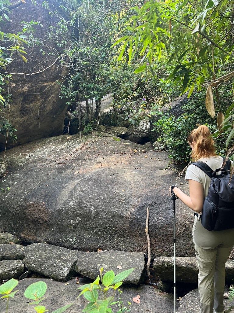 Les cent premiers mètres nous donnent un premier avant-goût indulgent de ce qui nous attend. Des marches en granit nous aident à nous élever lentement dans la forêt luxuriante. Le bruit des bateaux est progressivement remplacé par les mélodies toujours changeantes des oiseaux exotiques dans la canopée. Ayant perdu une bonne quantité de sang à cause des piqûres de moustiques dans la première demi-heure, nous décidons d’embrasser le pantalon à fermeture éclair et d’aller jusqu’aux chevilles. La randonnée toutefois perd rapidement son chemin et nous laisse explorer un étroit sentier de boue plutôt qu’un sentier bien défini. Assez vite, ce chemin lui-même disparaît, nous entrons dans une zone d’énormes rochers de granit crachant de l’eau entre les deux.