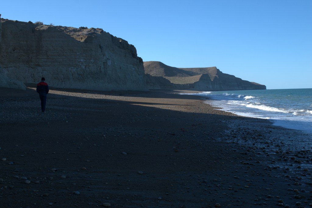 And despite the hardships, here on the Patagonian coast, Marc and I had the feeling for the first time that, if this trip would end right now, if it would only get this far – it would have been all worth it. We walked on the long, lonely beach of “Piramides”, near our camp, followed with enthusiasm – as always – by what seems to be the local “town dog”. This beach had a very special energy; with every minute, I felt it calming my soul. Broken by all the tide pools, the small waves here had a soft and gentle sound; instead of the usual “woosh”, the beach sounded more like walking along a quiet brook. The fierce wind painted complex patterns on the azul-blue surface; it is amazing how air here is so visible that it shows its real substance. Towering steep cliffs along this beach eventually turn into soft sandy dunes, completely undeveloped. There’s so few people coming here that they remain open to explore and climb around in.