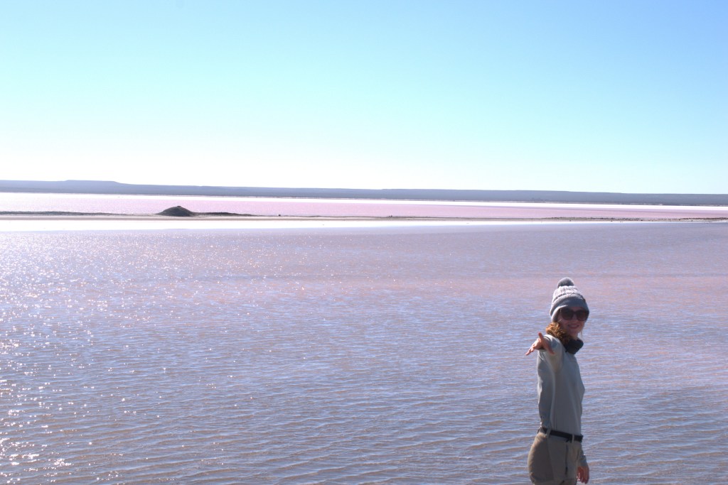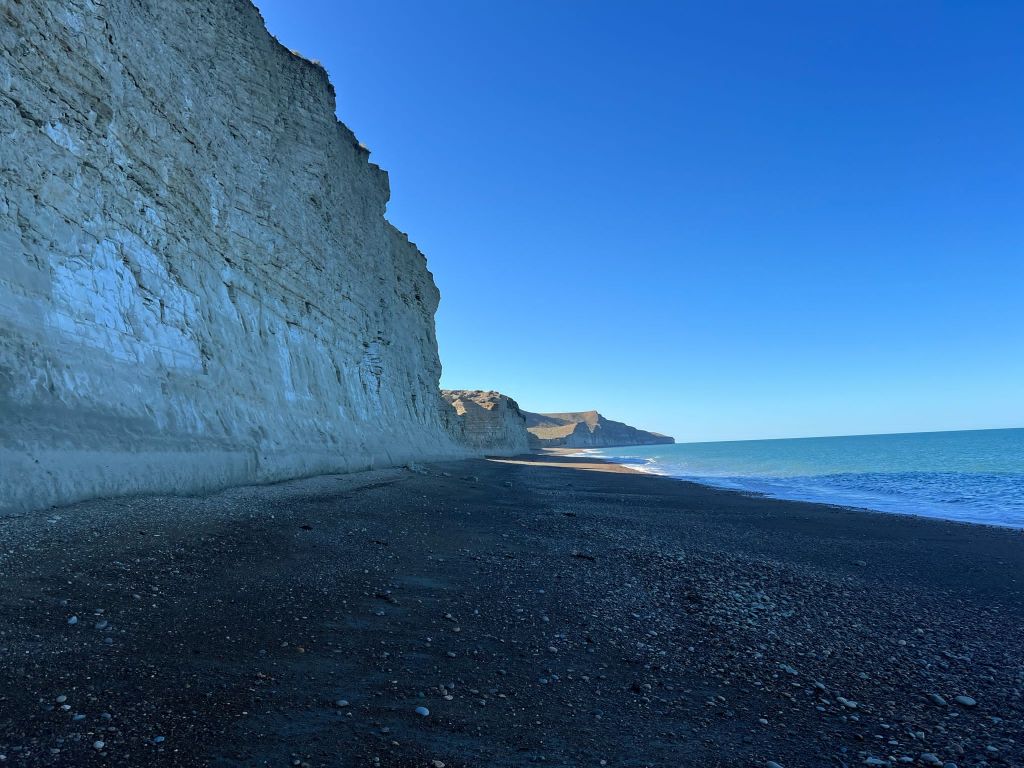 Les couleurs ici sont irréelles ; dans mes tentatives pour devenir un rêveur lucide professionnel, je me pose la question « Suis-je en train de rêver ? » plusieurs fois par jour, et y répondre est devenu de plus en plus difficile ici en Patagonie. Il y a toutes les nuances de beige et de rose pastel sur la terre, avec des taches noires dues aux incendies précédents, ou des herbes d’un or éclatant, qui rencontrent un incroyable bleu azur dans la mer. C’est vraiment un bleu que je n’ai jamais vu ailleurs dans un océan, une sorte de pétrole ou de turquoise foncé qui crée un fort contraste avec les falaises beiges et les plages rougeâtres. Les lacs salés blancs, roses et bleus scintillent au soleil. Ils rendent l’air si sec que nos mains et nos lèvres sont constamment fragiles.