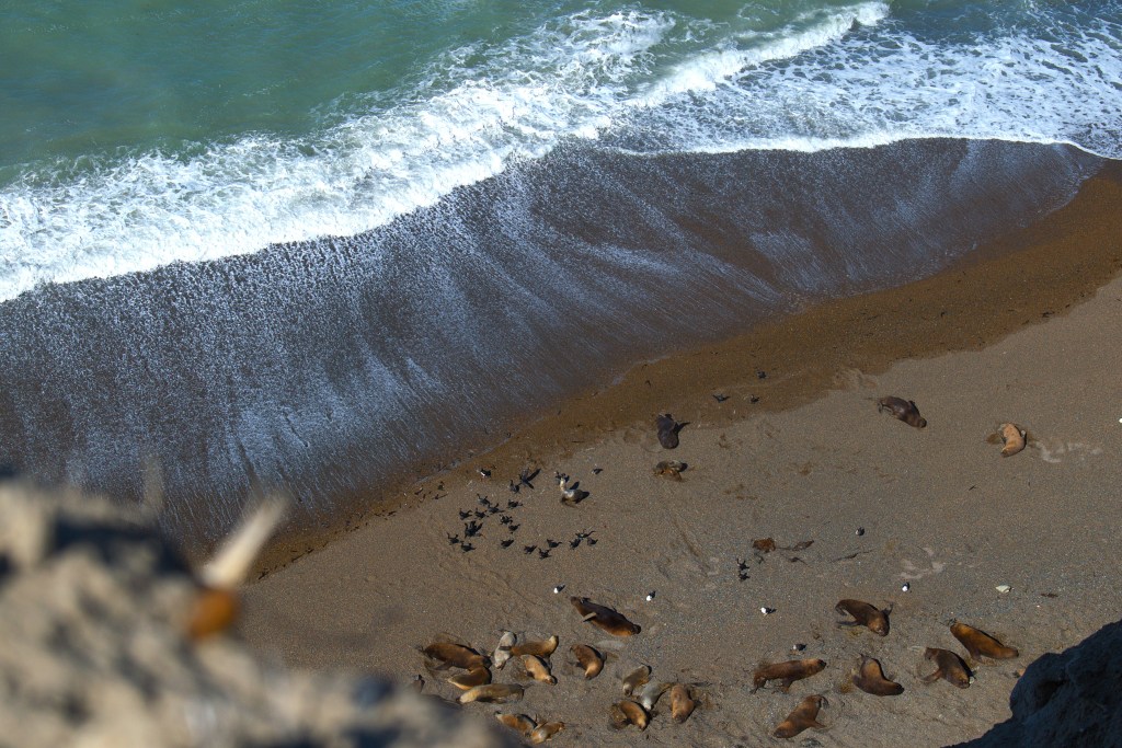 Am Ende trafen wir die Seelöwen aber doch aus nächster Nähe; eine der ikonischen Arten, die überall in dieser Region leben. Diese Tiere, die eher wie „Wasserhunde“ sind (im Vergleich zu den anderen großen Meeressäugern an dieser Küste, den „Seeelefanten“ oder „Robben“, die eher wie riesige Fettklumpen aussehen und sich an Land kaum bewegen), sind sehr aktiv, spielen, schwimmen, rennen herum und geben ständig ein lautes Konzert aus Grunzen und Knurren von sich.