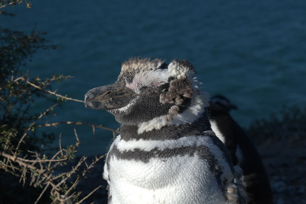 Mais le plus mignon de tous est sans doute le manchot. Le long de cette côte, plusieurs espèces se reproduisent en immenses colonies, et la péninsule Valdès est le point le plus septentrional où il est possible d’approcher les manchots de Magellan. Nous avons eu la chance de trouver les bébés de janvier dernier encore sur leur lieu de nidification, joufflus et adorablement mal soignés, essayant d’arracher leurs dernières plumes brunes duveteuses pour devenir de vrais manchots noirs et blancs comme leurs parents. Je me suis allongé sur le sol à quelques centimètres d’eux, et j’ai longuement regardé un manchot particulièrement petit en lui souhaitant bonne chance. J’espère qu’il grandira à temps pour parcourir les océans avec sa communauté.