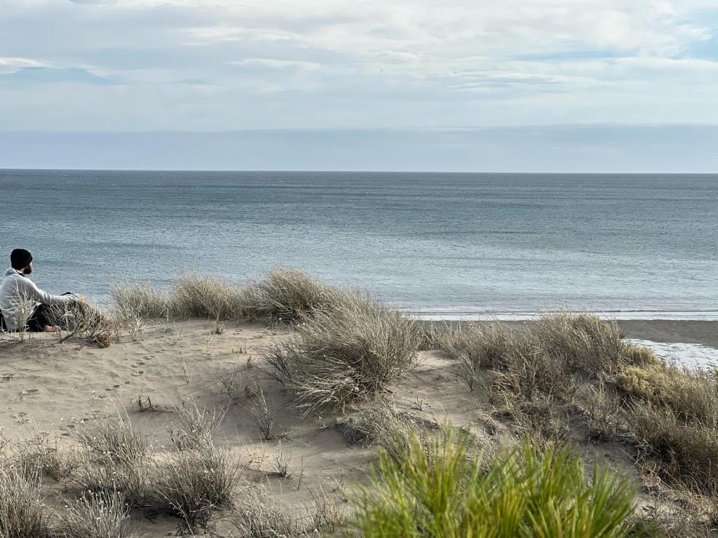 Und trotz aller Entbehrungen hatten Marc und ich hier an der patagonischen Küste zum ersten Mal das Gefühl, dass, wenn diese Reise jetzt enden würde, wenn wir nur bis hierhin kämen und nicht weiter, sich alles gelohnt hätte. Wir gingen am langen, einsamen Strand von Piramides in der Nähe unseres Lagers spazieren, wie immer mit Begeisterung gefolgt vom örtliche Stadthund. Dieser Strand hatte eine ganz besondere Energie; mit jeder Minute spürte ich, wie er meine Seele beruhigte. Durch die vielen Gezeitentümpel gebrochen, hatten die Wellen hier einen sanften und weichen Klang; statt des üblichen „Woosh“ klang der Strand eher wie ein Spaziergang entlang eines ruhigen Baches. Der heftige Wind malte komplexe Muster auf die azurblaue Oberfläche; es ist erstaunlich, dass die Luft hier so sichtbar ist, dass sie ihre wahre Substanz zeigt. Die steil aufragenden Klippen entlang dieses Strandes gehen schließlich in weiche Sanddünen über, die völlig unbebaut sind. Es kommen so wenige Menschen hierher, dass sie offen bleiben, um sie zu erkunden und darin herumzuklettern.