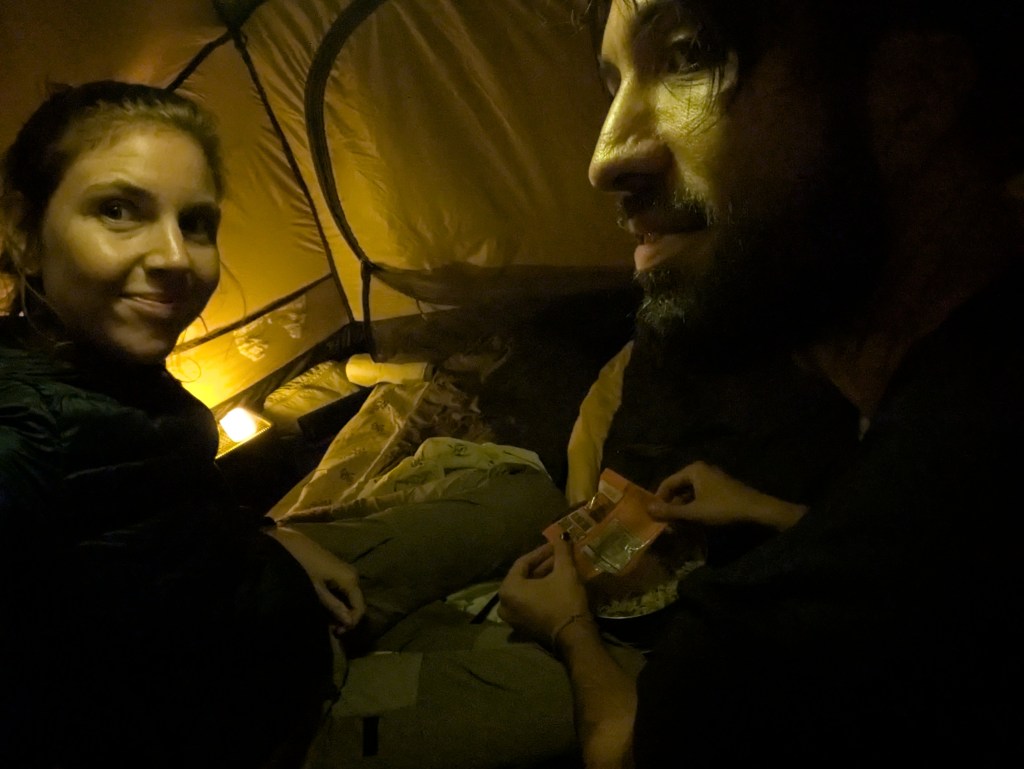 Wir haben eben grade erst gelernt, wie man sich im Campingleben zurechtfindet; wir hatten beide absolut keine Erfahrung damit, so dass der Sprung ins Extrem-Camping für uns ein bisschen schwierig war. Es gab definitiv eine Lernkurve. Einige Lektionen mussten wir auf die harte Tour lernen: 1) die Kapuzen der arktischen Schlafsäcke gibt es aus einem guten Grund; man sollte sie immer aufziehen und sich „ein-raupen“; 2) zu wenig Belüftung ist der Killer; es ist wichtig, einen Teil des Zeltes offen zu lassen, um etwas kalte Luft hineinzulassen, damit sich nicht überall Wassertropfen bilden; 3) einige Hampelmänner oder Squads kurz vor dem Schlafengehen helfen; die Schlafsäcke erzeugen keine Wärme, sondern halten nur die Wärme, die man selbst erzeugt.
