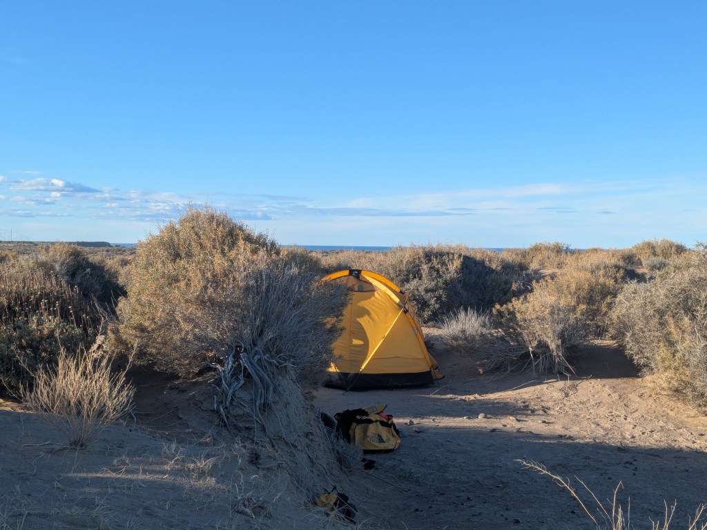Et malgré les difficultés, ici, sur la côte patagonienne, Marc et moi avons eu pour la première fois le sentiment que, si ce voyage s’arrêtait maintenant, s’il n’allait que jusqu’ici, il en aurait valu la peine. Nous nous sommes promenés sur la longue plage isolée de « Piramides », près de notre camp, suivis avec enthousiasme – comme toujours – par ce qui semble être le « chien de la ville ». Cette plage avait une énergie très spéciale ; à chaque minute, je la sentais apaiser mon âme. Brisées par toutes les mares, les petites vagues avaient un son doux et léger ; au lieu du « woosh » habituel, la plage ressemblait plus à une promenade le long d’un ruisseau tranquille. Le vent violent peignait des motifs complexes sur la surface bleu azur ; il est étonnant de constater que l’air est si visible qu’il révèle sa véritable substance. Les falaises abruptes qui bordent cette plage se transforment finalement en dunes de sable doux, complètement inexploitées. Il y a si peu de gens qui viennent ici qu’elles restent ouvertes à l’exploration.