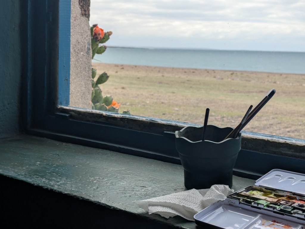 The colors here are unreal; in my attempts to become a professional lucid dreamer, I ask myself the question “Am I dreaming?” several times a day, and answering it has become increasingly difficult here in Patagonia. There’s every shade of beige and pastel rose on land, with patches of black from previous fires, or of bright golden grasses, meeting an incredible azul-blue in the sea. It’s really a blue I’ve never seen in an ocean anywhere else, a kind of petrol or dark turquoise that creates a strong contrast with the beige cliffs and reddish beaches. There’s white and pink and blue salt lakes all over, glittering in the sun. They turn the air so dry that our hands and lips constantly feel brittle.