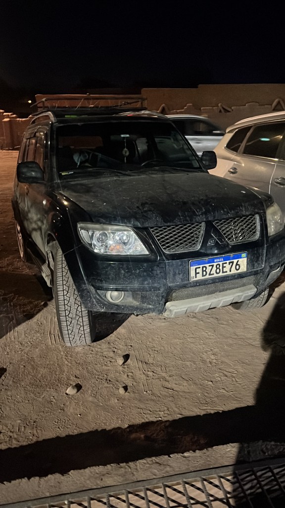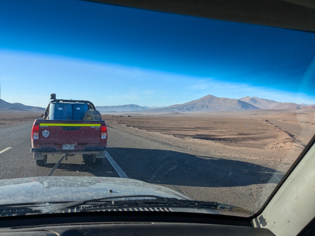 I jump behind the wheel and start making my way back to San Pedro. The almost 4hours drive includes going from sea level to 2600m. I drive the whole way almost without stop. The whole way carrying a lingering anxiety of the recent engine failure. The way is long and monotonous, here copper and sulfur mines carve away large parts of the desert, and for a long while I sit driving slowly behind gigantic machinery being transported to carve the earth furthermore. Still the excitement of having our car back carries me along. Light falls slowly and I drive into the night, making my way to San Pedro safely, and without issue. 24hours before we were entirely convinced that it would never happen, there did not seem to be any possibility of us being able to resume our journey the way we had laid it out initially, and certainly no way to continue with Piure. Though that last point brought about a caveat to the celebration. Now that we had our car we were going to Bolivia, and Piure wasn’t.