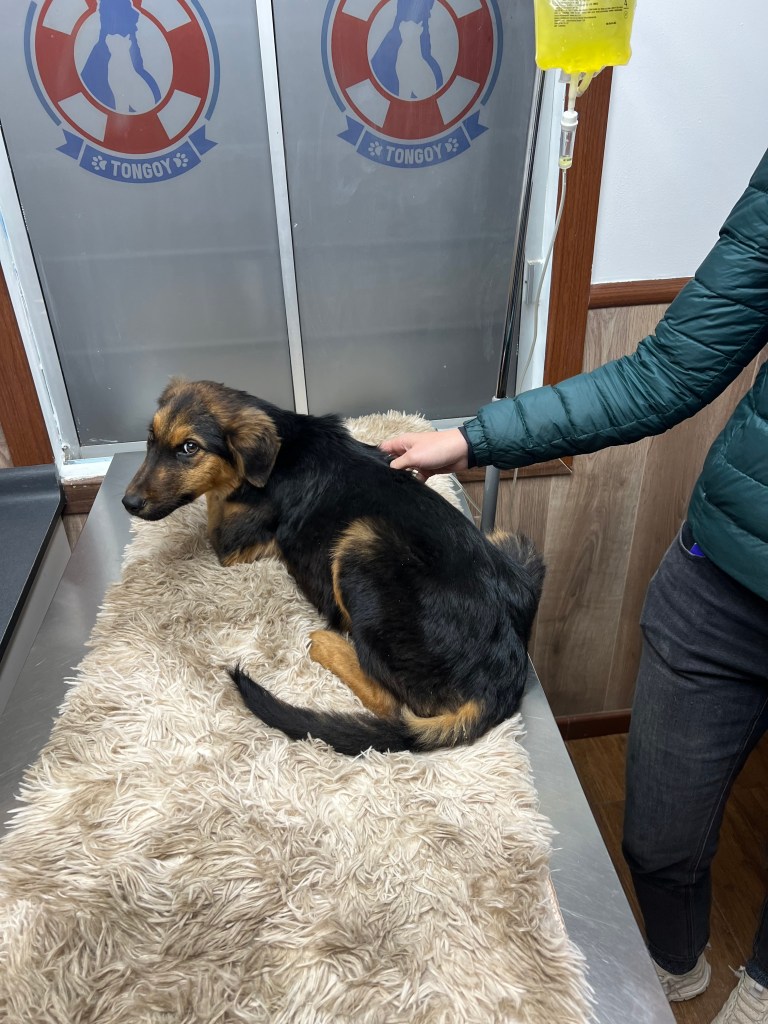 Nous avons dit à tous ceux qui voulaient l’entendre que, pendant notre absence, nous adopterions probablement un chien et que nous reviendrions avec lui. Eh bien, nous avons des nouvelles à ce sujet. Il y a environ trois semaines, dans la ville côtière de Tongoy, où nous visitions le marché aux poissons, nous sommes tombés sur un chien errant malade. Ce jeune chiot était gravement sous-alimenté et déshydraté. Lorsque nous l’avons trouvé, il était à peine conscient, se balançant dans la rue et refusant de boire et de manger. Léonie n’a pas hésité à le prendre dans ses bras et depuis, nous sommes à ses côtés.