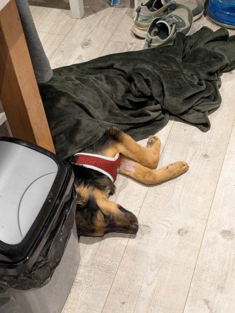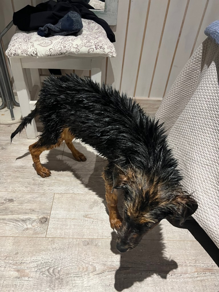 Nous avons eu la chance inouïe de séjourner dans un AirBnb géré par Anita. Elle n’a pas hésité une seconde à nous permettre d’amener ce chien des rues qui avait désespérément besoin de notre aide. Nous lui en sommes infiniment reconnaissants ; je ne pense pas qu’il aurait passé cette nuit s’il avait dû retourner dans la rue, mais nous ne l’aurions pas laissé faire. Lorsque nous sommes rentrés à la maison, nous lui avons donné ce que nous supposons être sa toute première douche, et nous avons lavé la saleté et les cicatrices qu’il avait sur lui. Nous sommes allés nous coucher ce soir-là, incertains de ce qui se passerait le lendemain matin. Il s’est endormi rapidement et sans aucun scrupule, sa respiration était superficielle, sa peau contre ses os nus avec à peine quelques muscles restants.