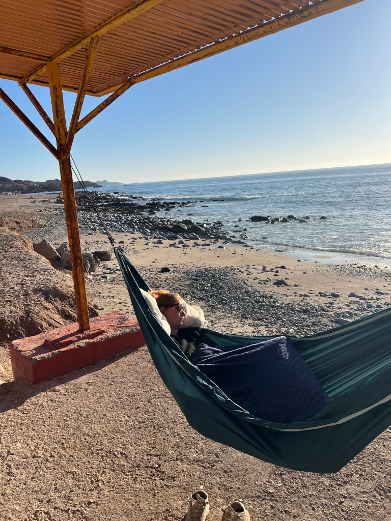 Mais la vie trouve son chemin. Nous devions trouver le nôtre, à la fois pour quitter Taltal et pour sortir de nos boucles négatives. Poussés en partie par notre situation financière désastreuse, nous avons décidé de passer la nuit suivante à camper au bord de la plage, malgré la froideur du désert. Le seul endroit que nous avions trouvé se trouvait à environ 15 minutes de la ville en voiture, et avec le chauffeur de taxi, nous avons parcouru la plage à la recherche de ce qui semblait être l’endroit le plus hospitalier. Cependant, les panneaux d’interdiction de camper très présents m’ont fait craindre d’être réveillés par le son des sirènes de police, ou pire encore. Avant de nous installer pour la nuit, je me suis donc rendu à un camping voisin supposé fermé pour me renseigner. C’est là que nous avons rencontré Carlos et Priscilla.