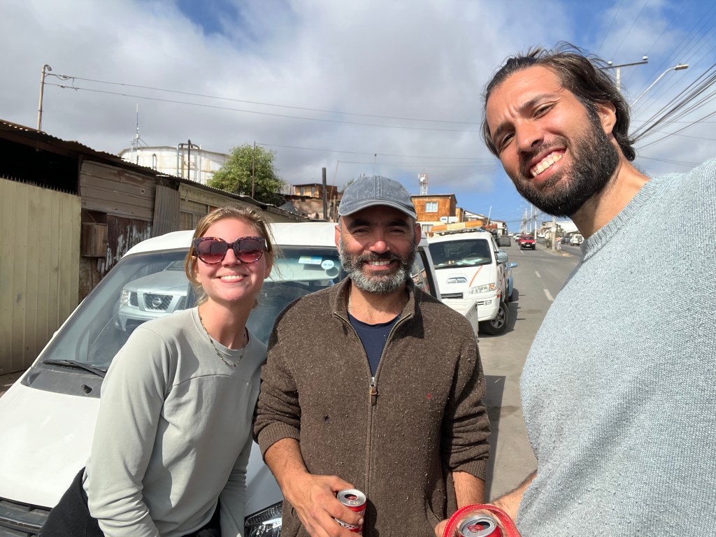 Notre séjour à Taltal ne devait cependant pas durer. J’ai passé des heures sur WhatsApp à coordonner et négocier le remorquage, les mécaniciens et nos options, le tout en espagnol, en utilisant des traducteurs pour essayer de me faire comprendre. Je jonglais avec 6 conversations différentes, avec des dépanneurs qui refusaient à la dernière minute, des garages qui ne voulaient pas nous prendre, le tout aggravé par le fait que nous n’avions pas de logement à Taltal, nous étions en fait des sans-abri avec un chien. Finalement, incapable de réparer notre voiture, notre mécanicien nous a aidés à organiser un transfert 3 heures plus au nord, à Antofagasta, une ville beaucoup, beaucoup, beaucoup plus grande. Malheureusement pour nous, la remorque est arrivée avec 5 heures de retard, ce qui signifie que nous avons dû arriver tard dans la nuit en ville, mettant à rude épreuve la patience et l’amabilité de notre hôte Airbnb. Nous nous sommes endormis avec environ 300€ de moins, ne sachant toujours pas où le lendemain nous mènerait, avec seulement la vague idée que le mécanicien ici serait plus compétent.