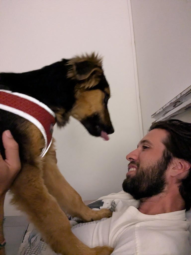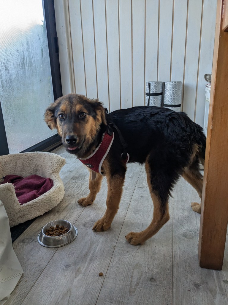 Le lendemain matin, nous nous sommes réveillés et l’avons trouvé en bonne santé, nous attendant, probablement confus de ce qui s’était passé. Il a tout de même décidé de nous faire confiance. Nous sommes allés faire notre première toilette matinale (incroyable, il est déjà venu complètement propre !) et nous avons commencé à faire de notre mieux pour nous occuper de lui. Nous l’avons nourri, lui avons donné de l’eau, avons essayé de le réconforter, il était encore très faible mais nous pouvions voir qu’il n’essayait pas de nous fuir. Nous l’avons emmené faire notre première petite promenade ensemble autour de la maison, et nous avons regardé le premier d’une longue série de couchers de soleil ensemble.